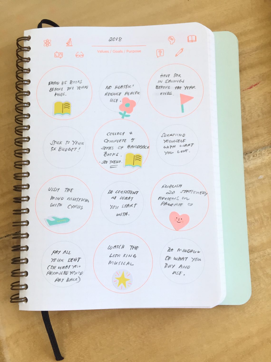 You’ll then find the Values/Goals/Purpose page where you can write/draw your goals and aspirations. I chose to label mine with “2018” and fill the cute bubbles with my goals for this year and my values in life. You’ll see that I used the free Mossery stickers I got to emphasize each goal.