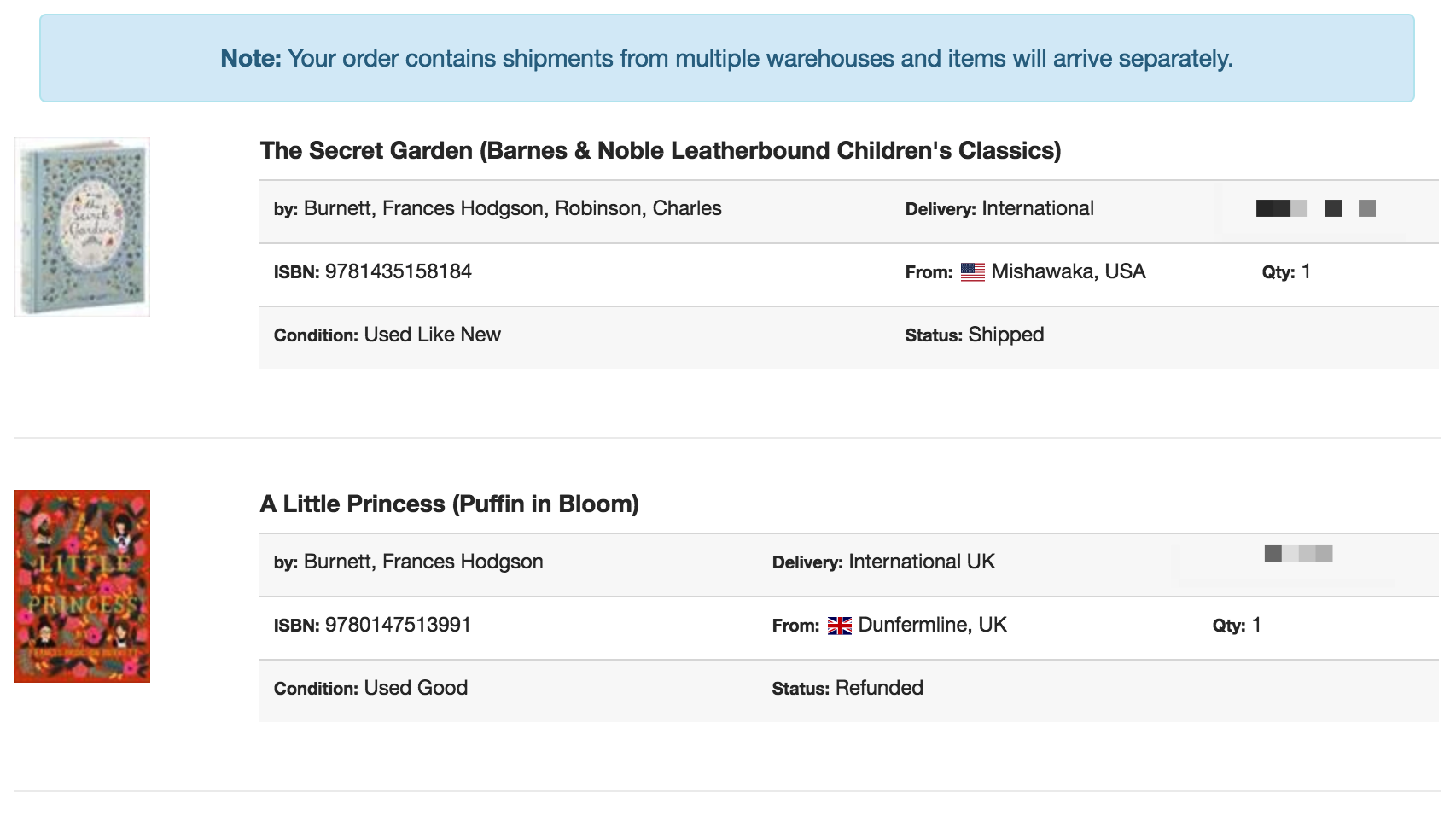 Since A Little Princess was refunded and used for a different order, I’ll share the tracking log for The Secret Garden instead: