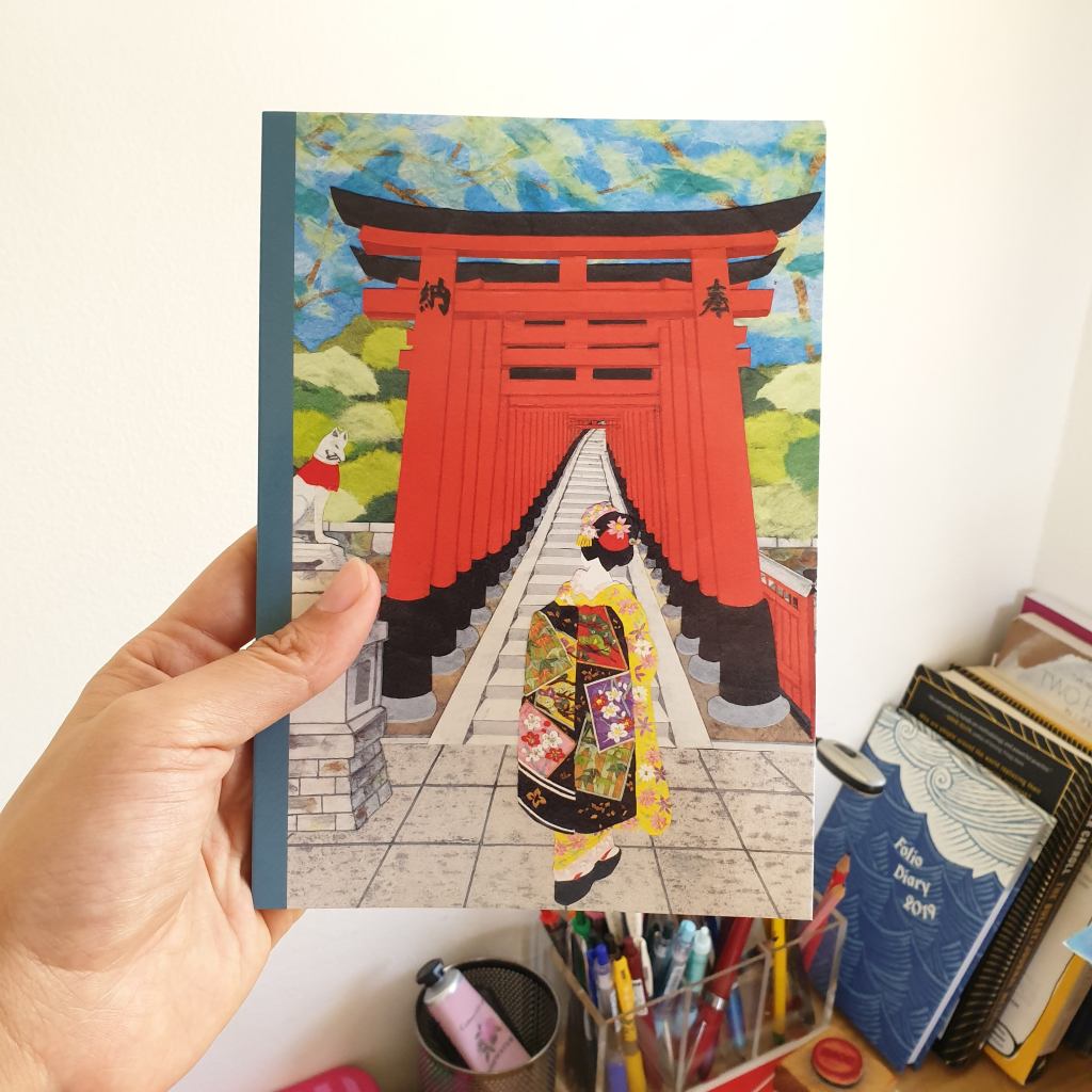 If it weren’t for the boys being so fussy, I wouldn’t have spotted one of these souvenir shops selling Japanese stationery. This B6-sized notebook’s plain as it is, but the cover features a Japanese geisha staring at the fox guardian as she’s about to journey into the tori gates. It drew me in right away that I had to take it with me before we got back on the bus.
