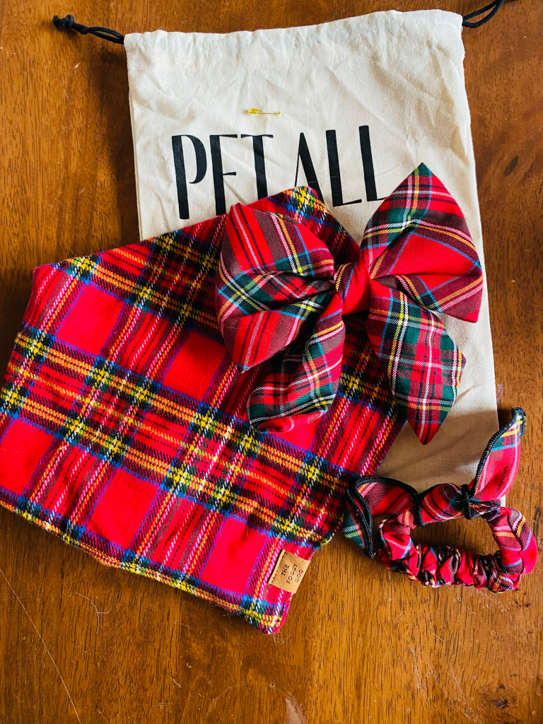 I can’t think of anything else that speaks festive Christmas than The Foggy Dog Tartan plaid. I got Brooklyn the bandana, Windy her first sailor bow (the brand called it a “lady bow”), and a matching scrunchie for me.