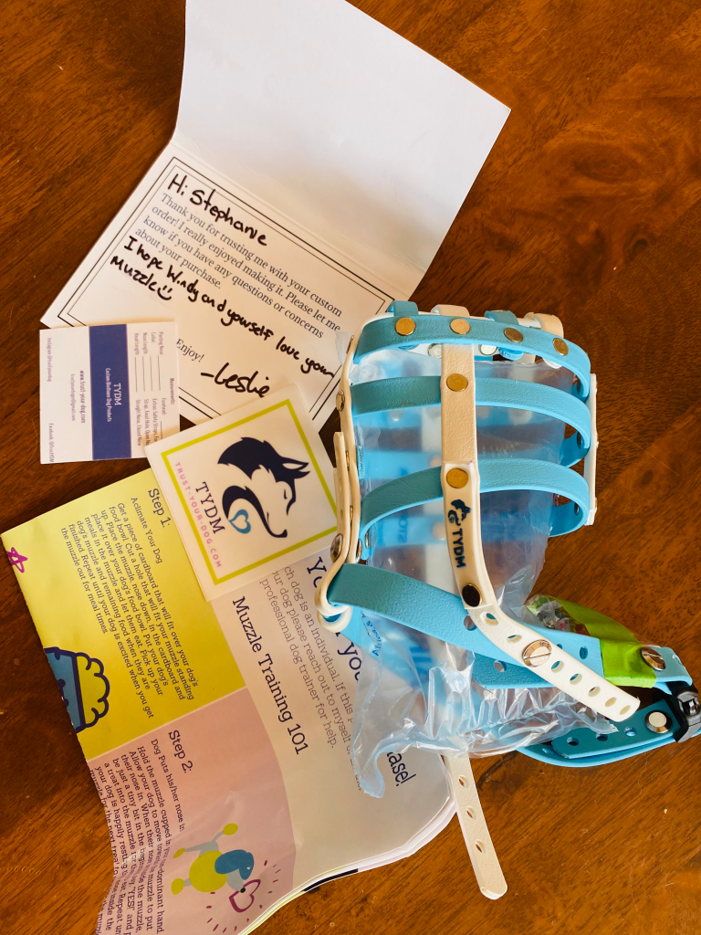 Last but definitely not least is Windy’s Trust Your Dog custom muzzle, something I’ve been eagerly waiting for a long time! She’s been snarfing poop and all kinds of nasty things during our walks since going on a diet, so I felt it was time to invest in one.