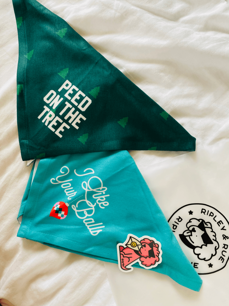 Badass Ripley & Rue released a collection of Christmas-themed bandanas that could turn heads and make anyone laugh out loud. I got “Peed on the Tree” for Brooklyn because he’s a walking hose and “I like your balls” for Windy. 😂