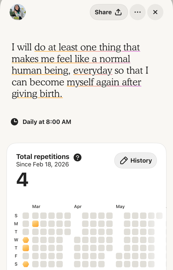 I will do at least one thing that makes me feel like a normal human being everyday, so that I can becomes myself again after giving birth.